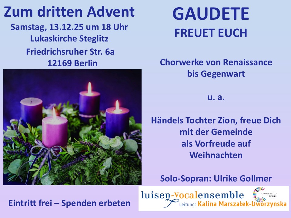 Am Samstag, dem 13.12.25 um 18 Uhr wird das LVE in der schönen Lukaskirche Steglitz ein Adventskonzert veranstalten mit Chorwerken von Renaissance bis Gegenwart. Da der 3. Advent den Titel Gaudete „Freuet Euch“ trägt, wird die Gemeinde aufgefordert, Händels „Tochter Zion, freue Dich“ zum Abschluss mitzusingen als Vorfreude auf Weihnachten.